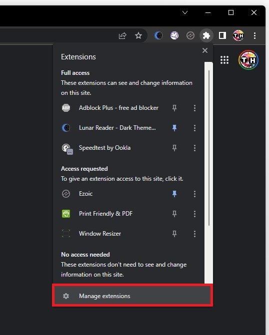 You can then open your Google Chrome browser and test if the problem has been resolved. If the problem persists, click on the extension’s icon and select Manage Extensions.