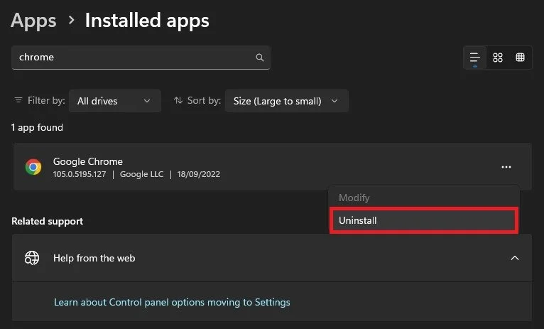 As a last resort, you will have to reinstall the Chrome browser on your system, as some files might be corrupted. In your Windows settings, navigate to the Apps section. Under Installed Apps, search for Chrome. You might have to filter your search by all drives if you cannot find the Google Chrome application.