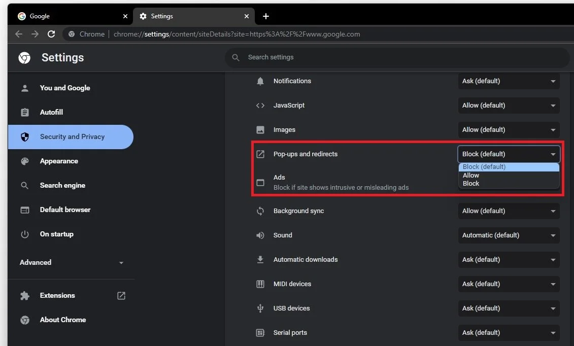 Under Pop-ups and redirects, you can change your default pop-up settings for all websites. Below, you have access to Customized behaviors to sites you allow to send pop-ups or those which have been blocked.