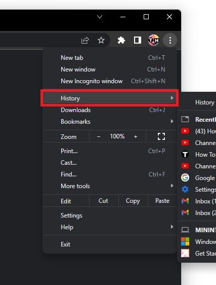 If you closed your Chrome window completely, or if Chrome or your PC crashed while using Chrome, you must navigate to your browser history to find your past tabs. Click on the burger menu on the top right of your window and select History. From here, you can find your last visited sites and recently closed tabs on those sites. In addition, you can find the history of all other devices signed in with your account using Chrome, such as your mobile device.