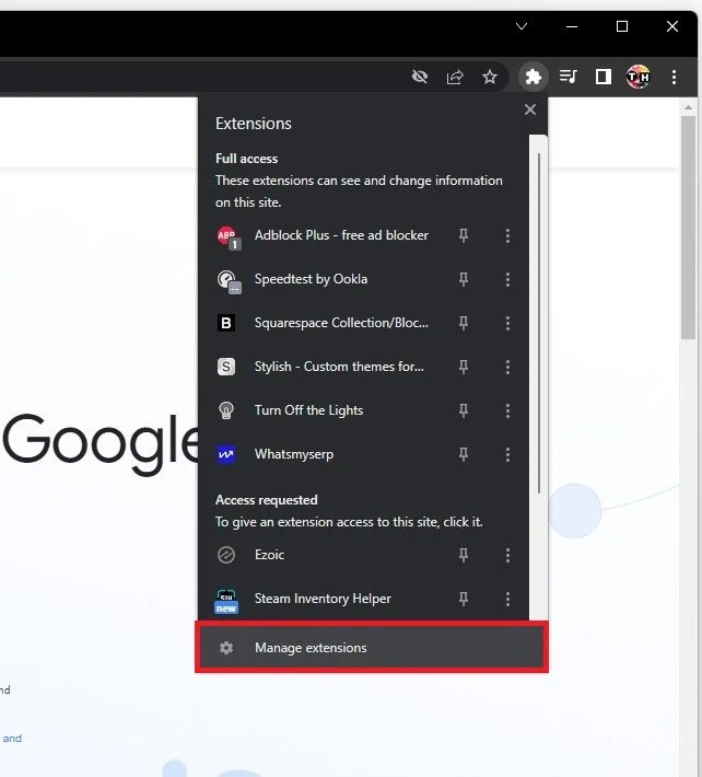 If you can access the website using a different browser, then the issue is related to your Google Chrome browser or software running on your system. Open Chrome and select the extension’s icon on the top right of your window. Select Manage Extensions.