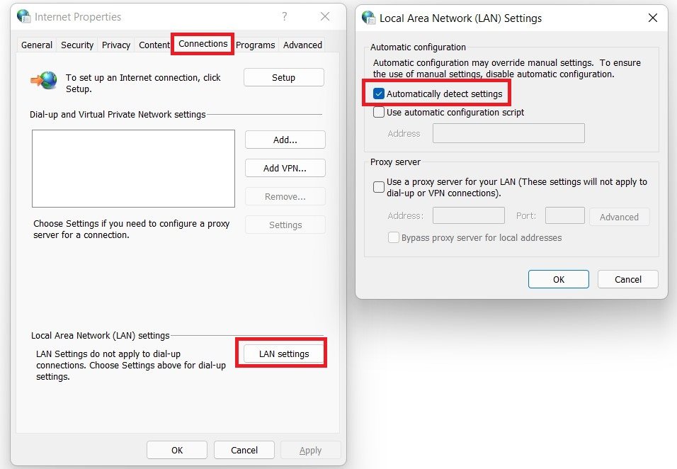 Open up your internet explorer. Click on the gear icon on the top right to access your settings and then select Internet Options. On this window, click on LAN Settings in the Connections tab, and ensure that the Automatically detect settings option is checked.