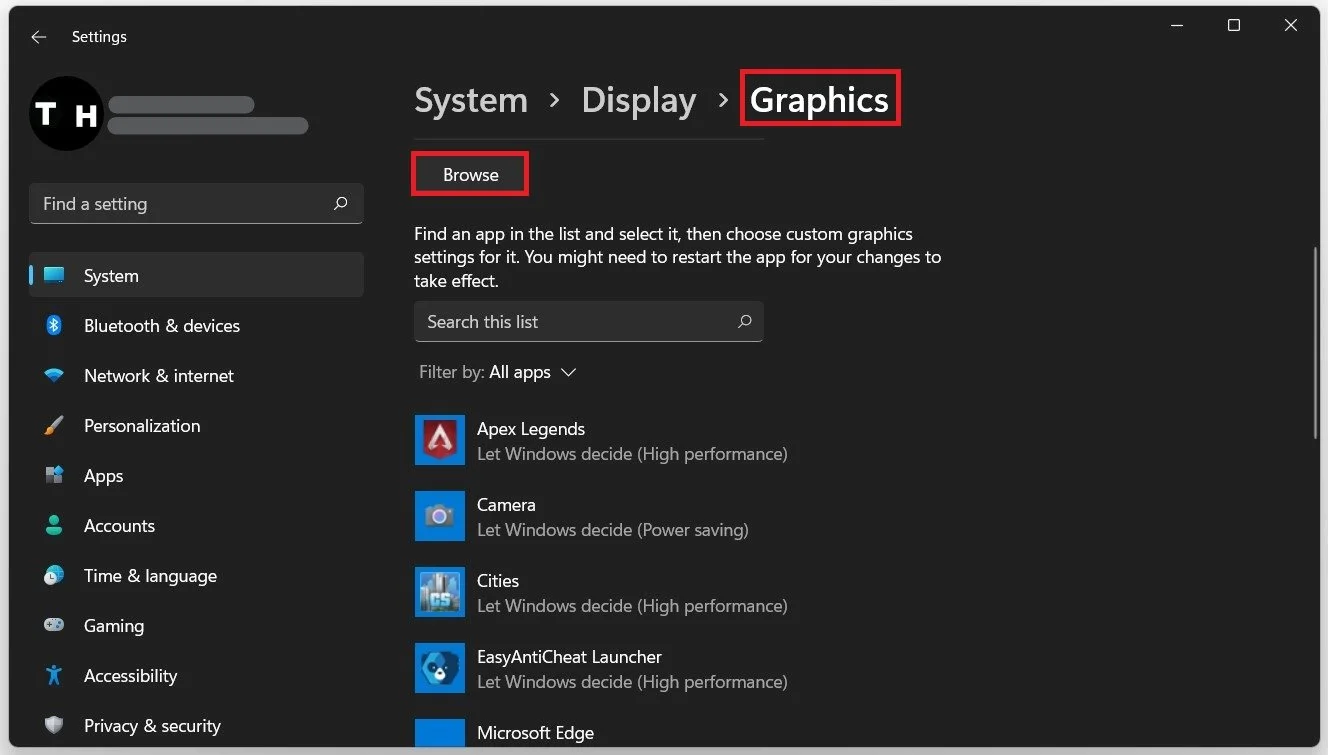 Lastly, search for Graphics Settings and open up your graphics system settings. On the window, select Browse, and your file explorer will open up. Navigate to the drive on which you saved the game on. This will also depend if you’re using the Steam or Epic Games version. For the Epic Games version, navigate to: Program Files > GTA 5. Select the GTA5.exe application and then add it to the program list. Once it's added, you can change the application's options, so that the graphics preference is set to High Performance. Don't forget to apply your changes.