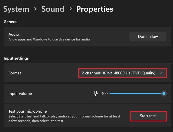 Next, select your headphones and ensure they're set to your default sound device. In your Output settings, set the Format to 2 channels, 16bit, 44'100 Hz, or 48'000 Hz, whichever is available to you.