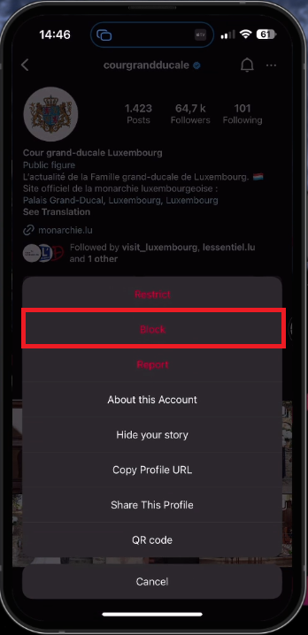 In case you want to hide your Instagram following list from certain individuals, you'll need to block their account. To do this, go to the user's Instagram profile. Click on the menu icon located at the top-right of your screen and select "Block".