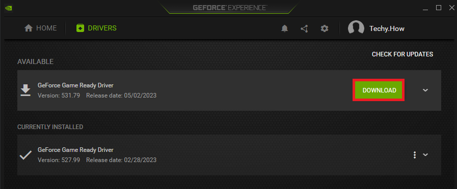 GeForce Experience > Drivers > Update
