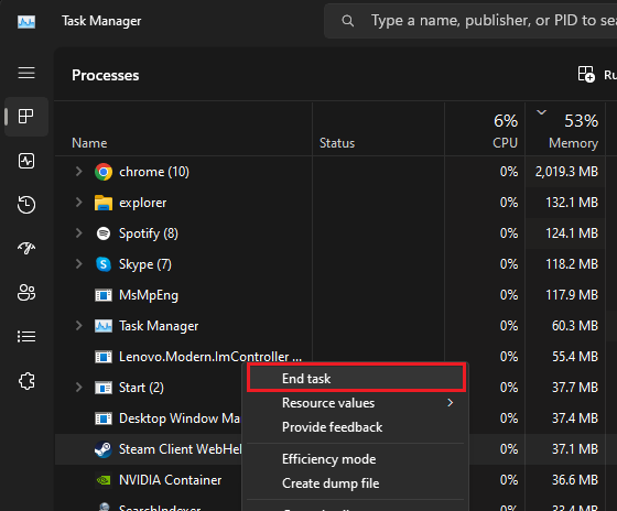 To get things rolling, initiate your Task Manager. Within the 'Processes' tab, pinpoint and terminate all active Honkai Star Rail tasks as well as any other high-demand applications currently operating on your computer. For instance, I often find myself needing to close Adobe software, Discord, or Steam.
