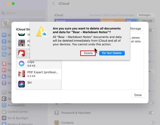 A list of apps will appear, including their storage utilization. When selecting an app, you will have the option to delete its data from your iCloud.
