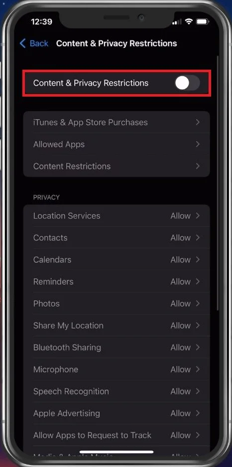 Disable Content & Privacy Restrictions