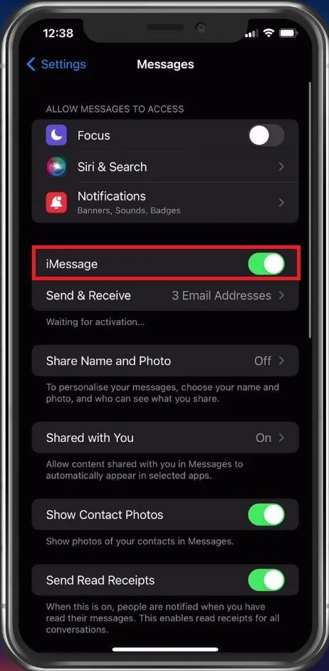 If the problem persists, head back to your main settings and tap on Messages. Ensure that iMessage is enabled. The same goes for FaceTime.