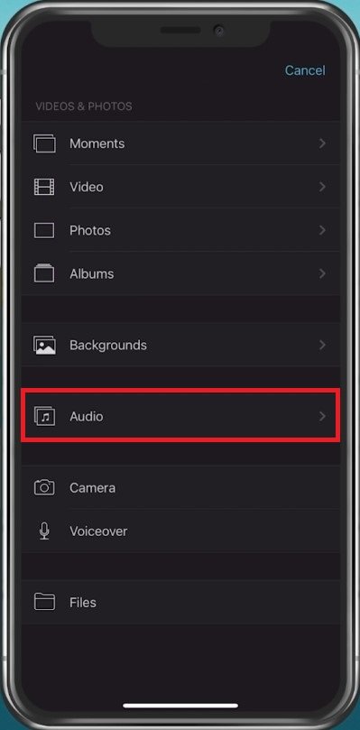Select Audio, and you can add soundtracks provided by the application. You can also use your music when tapping on My Music.
