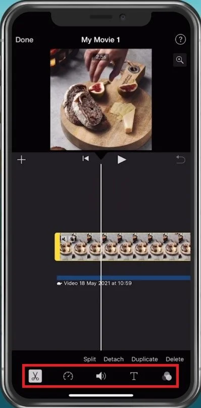 After importing a video into your timeline, tap on the video to which you want to add the text. This will show you this menu at the bottom of your screen.