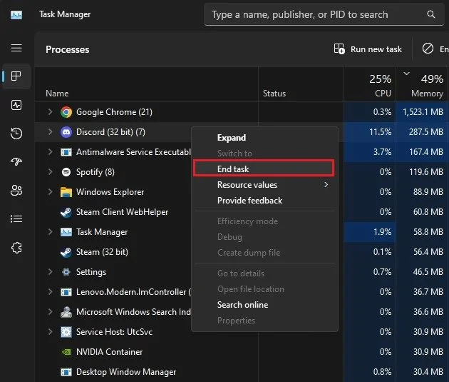 Task Manager > Processes