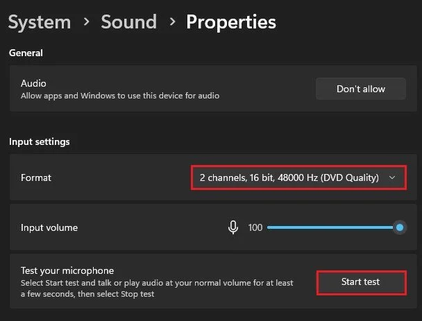 Click on your microphone and make sure that the Format option is set to 2 channels, 16bit, 44'100 Hz, or 48'000 Hz, whichever is available to you. You can test your microphone below to see how loud or quiet it is.