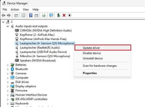 Close your Sound control panel and open your Windows Device Manager. On this window, expand your Audio inputs and outputs. Next, right-click your preferred microphone and select Update Driver. On this window, select Search automatically for drivers, which will take a second to download and install the latest microphone driver in case one is available.