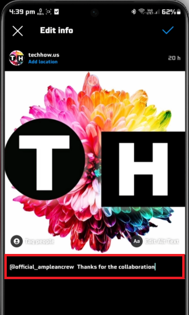 Edit the Caption: Once the edit menu is open, direct your attention to the caption field. Here, you have the freedom to mention your collaborators. To do this, append the '@' symbol before the username of each collaborator. An example might look something like this: '@johndoe @janedoe Loved working on this project with you both!'