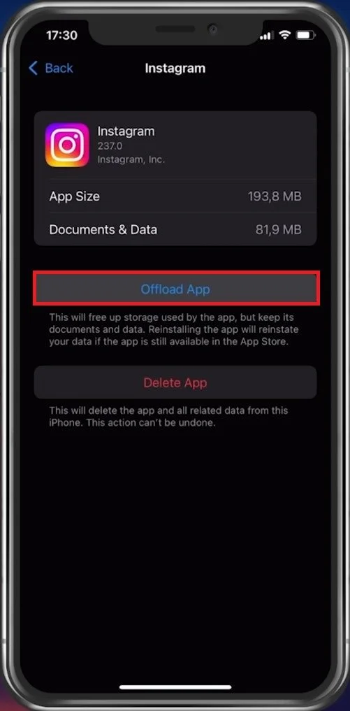 Search for Instagram and here tap on Offload App.This will delete your application’s cache, which includes data and stored information which could interfere with incoming direct messages.