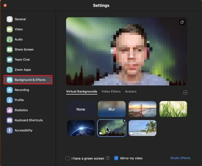 Under Background & Effects, you can select a preferred video background. Choose to blur your background or insert a different picture as your video background when joining a Zoom video call.