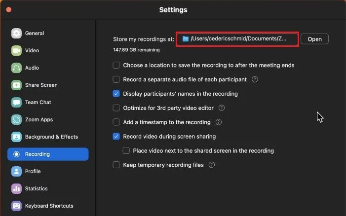 If you intend on recording Zoom calls, then navigate to the Recording section of your preferences. First, you’ll be able to change your Zoom recording download location on your Mac. Below, change some settings of your recordings, such as displaying the participants’ names or adding a timestamp to the recording.