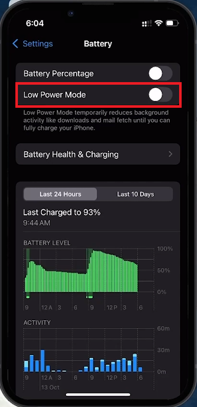 Next, you’ll need to make sure Low Power Mode is turned off.