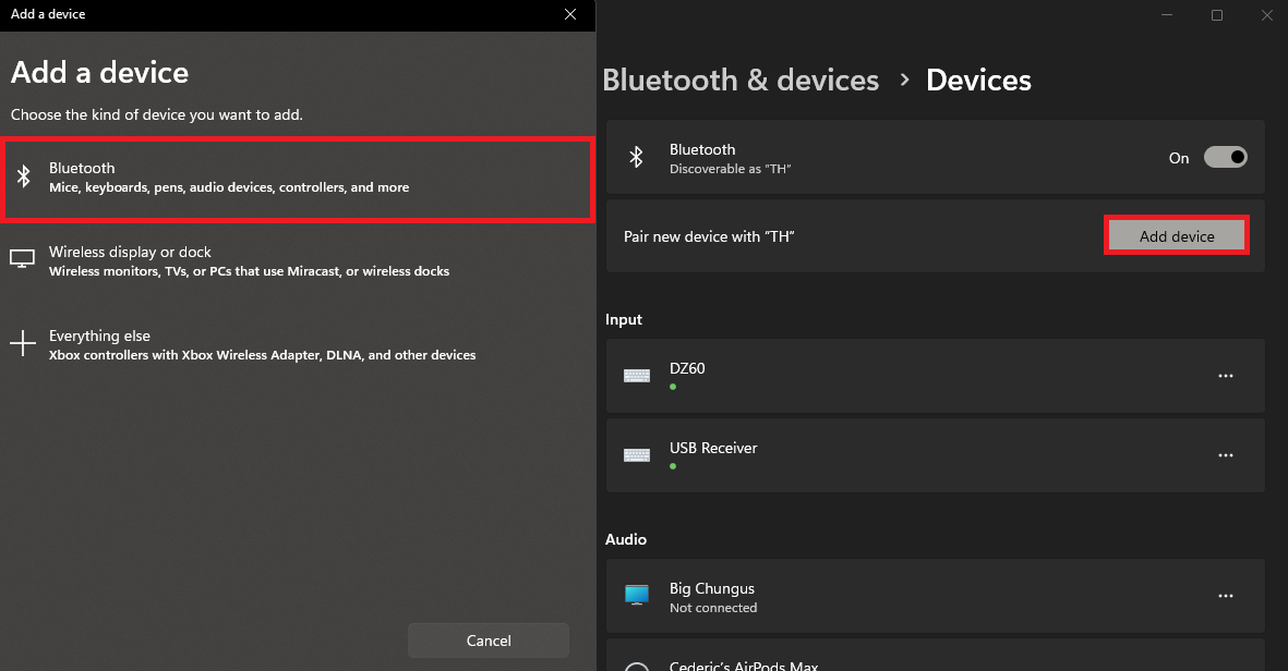 Windows Settings > Bluetooth & Devices > Add Device > Bluetooth