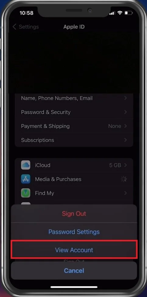 In case nothing helped you out, then head back to your iPhone settings. Here, tap on your Apple ID name and select Media & Purchases, and then View Account.