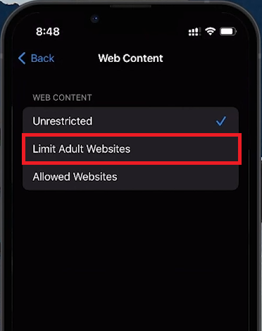 Tap 'Limit Adult Websites' to enable Apple's filters, blocking adult content automatically.