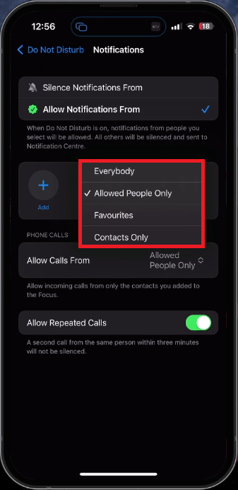 Next, move to the 'Allow Notifications From' section. Set the 'Phone Calls' preference to either 'Allowed People Only' or 'Contacts Only'. This step ensures that only callers saved in your Apple ID contacts can connect with you, securing your call environment from unwanted disturbances. This includes contacts synced across your Apple devices, like your Mac.
