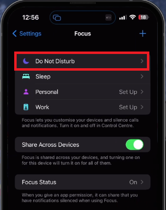 Ready to curate your own call environment? Navigate to your iPhone's settings and choose the 'Focus' option. From there, select the 'Do Not Disturb' feature.