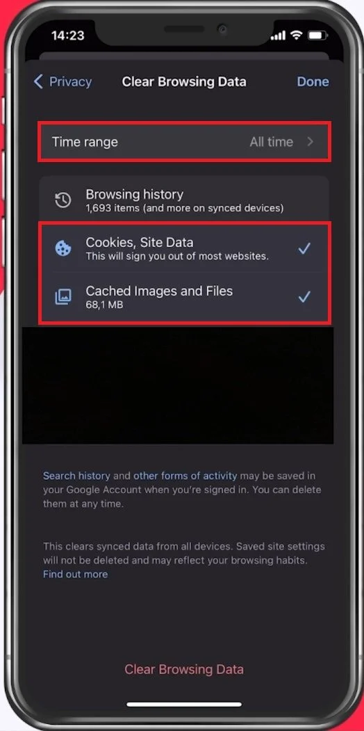 In your browser settings, tap on Privacy and then Clear Browsing Data. You can then select a time range and which files should be deleted. I’d suggest using the All Time range and deleting the cookies, site data, and cached images and files. In my case, it’s not taking up much space, as I have recently deleted these files.