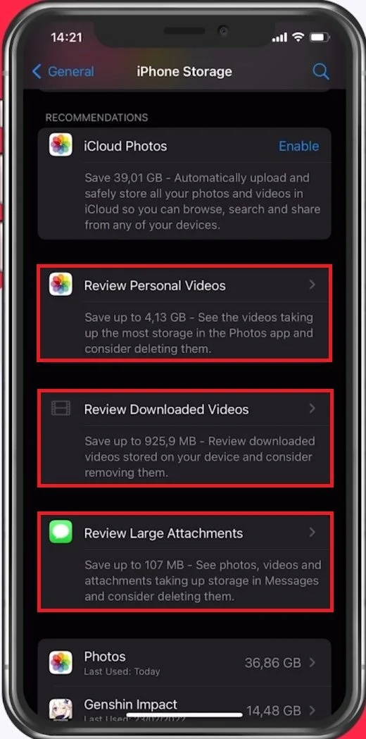 You might also have the option to review personal videos in case these take up a lot of storage on your device when expanding your recommendations and preview more tips to free up some storage, such as deleting large documents or enabling iCloud for photos. This will allow you to view the video or attachment, including their size, and determine if you should delete some.