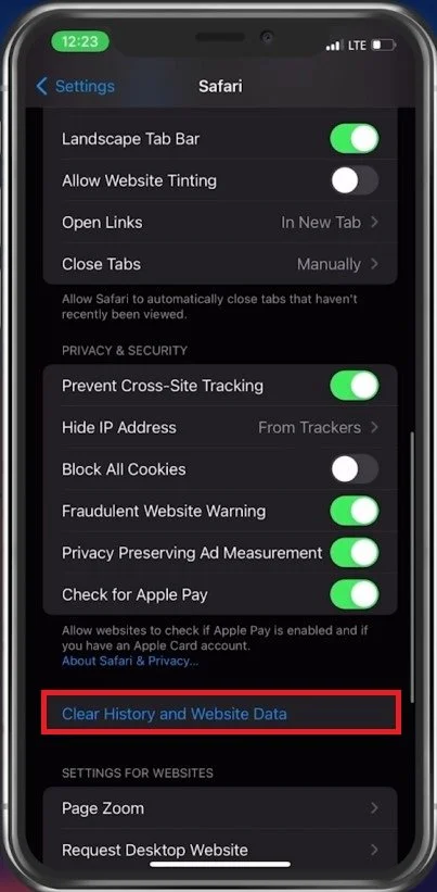 You might want to remove your Safari browser history and website data. Back in your main settings, scroll down, and select Safari. Scroll down and select Clear History and Website Data. This will remove your history, cookies, and other browsing data, such as login information and site preferences.