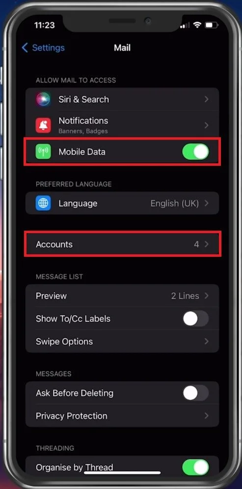 Navigate to your Mail settings. Here, make sure that the Mobile Data option is enabled. In addition, make sure that low power mode is disabled in your Control Centre as this will disable automatic email fetching.