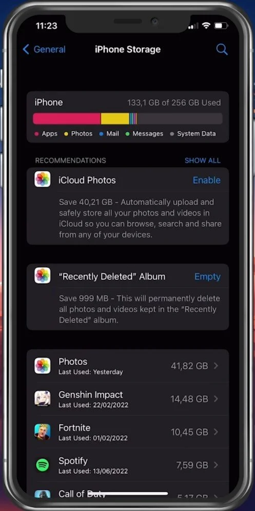 Ensure that your device has some available storage for additional mail to be loaded. In your General device settings, tap on iPhone Storage. It will take a second or two to load your storage information. If you have little to no storage left, I suggest offloading some unused apps or following some of the storage recommendations, such as removing watched movies on your device.