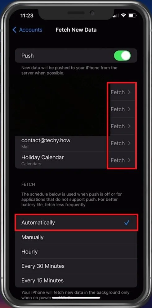 Under Fetch New Data, ensure that Fetch is used as your data schedule. This will make sure that your emails will arrive as soon as possible. Set the Fetch Schedule to Automatically below.