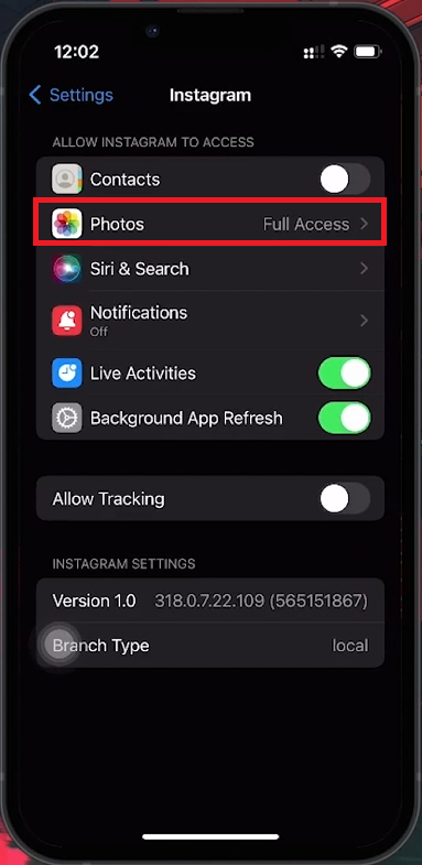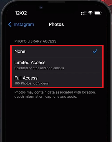 iPhone Settings > Instagram > Photos