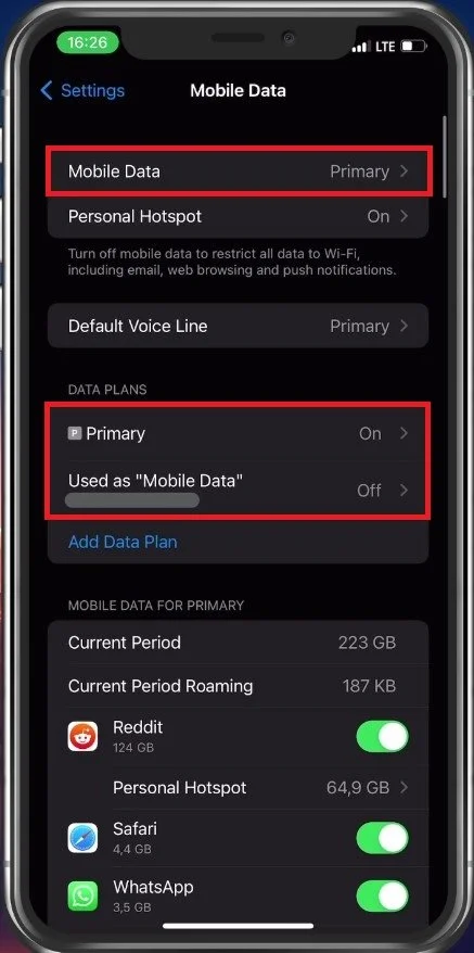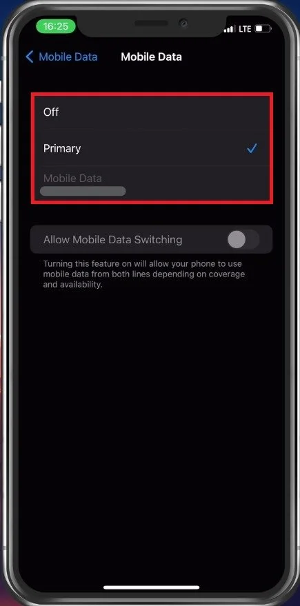 Make sure that cellular data is enabled in your settings. Tap on Mobile Data, and from here, you can enable mobile data for your primary SIM card or for your eSIM.