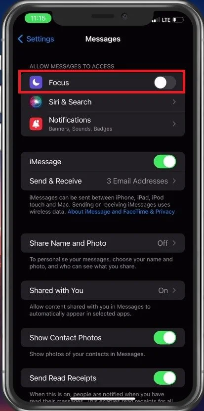 iPhone settings > Messages > Focus