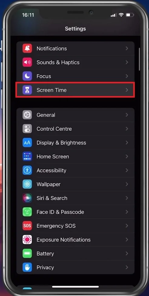To reset the screen time passcode on your device, open up your iPhone settings. From here, scroll down and tap on Screen Time.