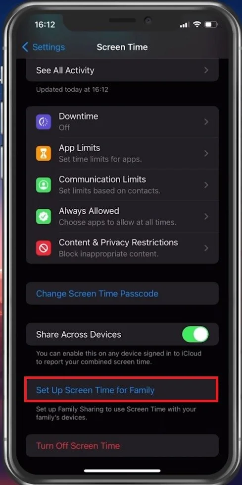 iPhone Settings > Screen Time > Set Up Screen Time for Family