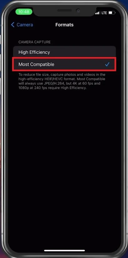 Make sure that you are using Most Compatible as your camera capture option. This will ensure that your photos are in JPEG or H.264 format and compatible with all apps and OSs. Your 4k and 60FPS videos will require High Efficiency to be saved on your device.