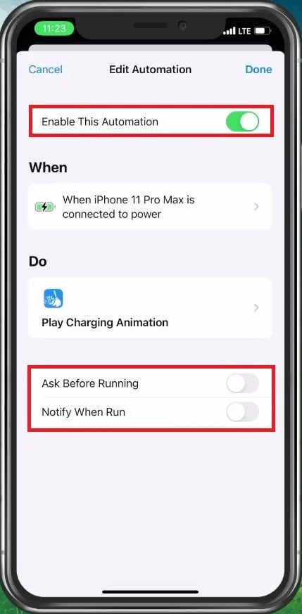Tap on it and make sure that Enable This Automation is toggled on. Below, you can enable or disable the Ask Before Running and Notify When Run options. You might want to leave these options disabled. This will allow the app to open automatically and show the animation once you plug your iPhone in for charging.