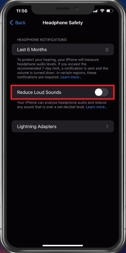 Next, navigate to your Sounds & Haptics settings. Here, tap on Headphone Safety and toggle the Reduce Loud Sounds option on and off.