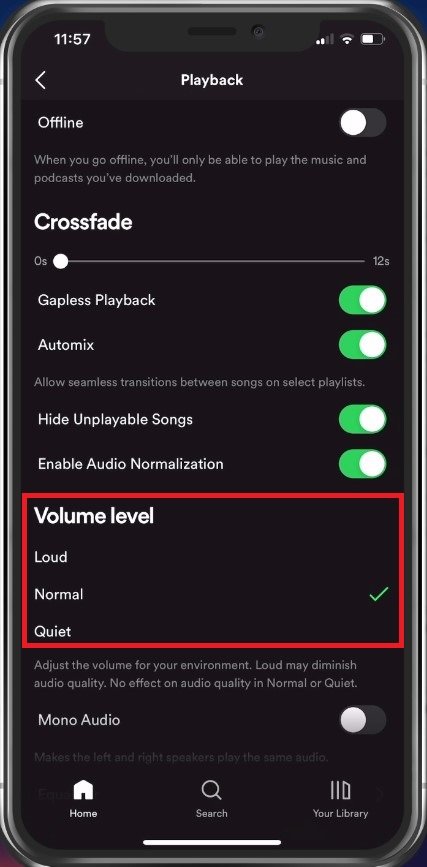 In your Spotify settings, select Playback. These options allow you to change some audio effects, and volume level and you have access to an equalizer, which allows you to make changes to the sound output for music within the app.