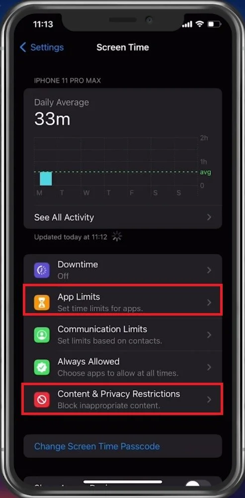 Any restrictions, such as Screen Time app limits or parental controls, can prevent you from changing your date and time. In your settings, head back to Screen Time.