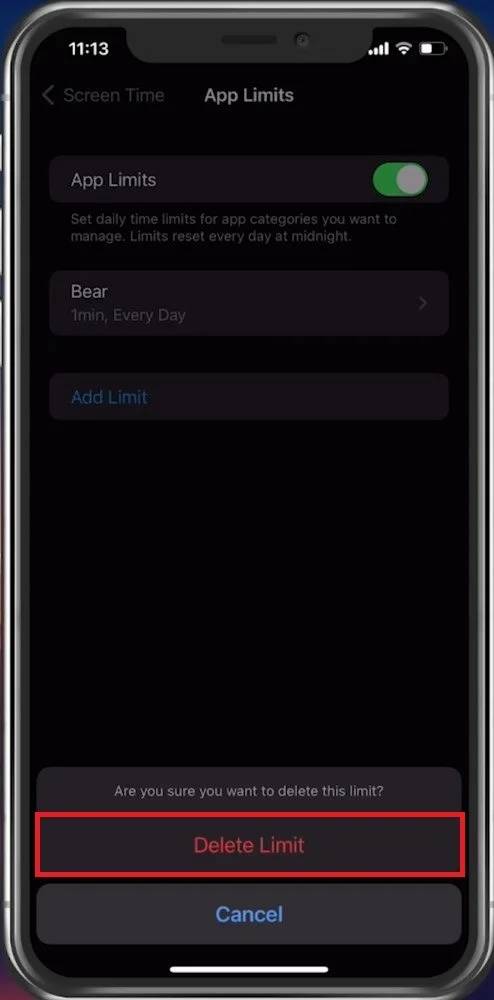 Tap on App Limits, and make sure to delete any limit which could interfere with you accessing your settings.