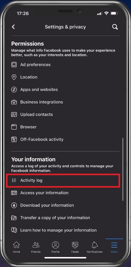 If this is not the case, navigate to your Facebook account settings. From here, scroll down and tap on Activity Log under Your Information.