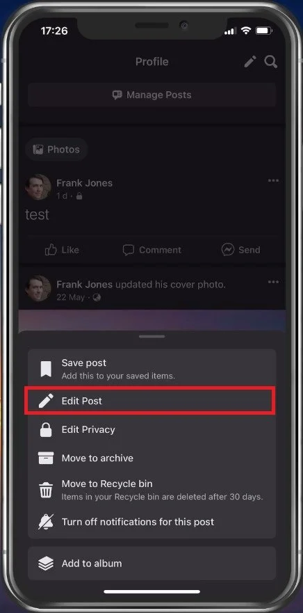 When this is done, you can open the Facebook application to see if this fixed the problem. Go to one of your recent posts and tap on the burger menu on the top right of the post to expand this menu.