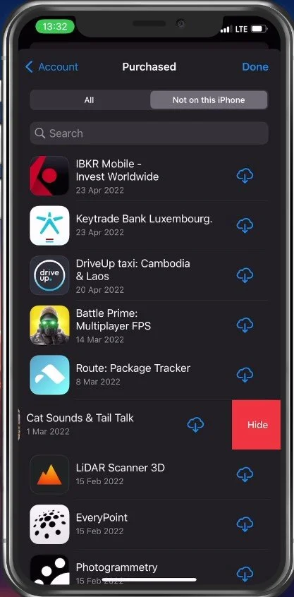 You will see a list of all free and paid downloads from the App Store. In the Not on this iPhone tab, you can preview all apps that are not installed on your device any more. When swiping one of these apps to the right, you can proceed to Hide the app from this purchased list. This will make sure that these apps will be deleted from your purchase history.