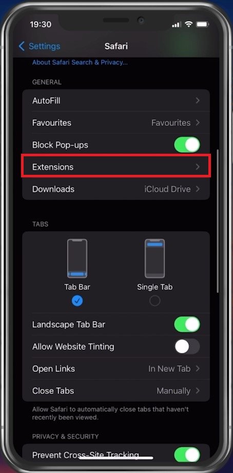 After the installation, open up your iPhone settings. Scroll down and tap on Safari. In your General settings, tap on Extensions.